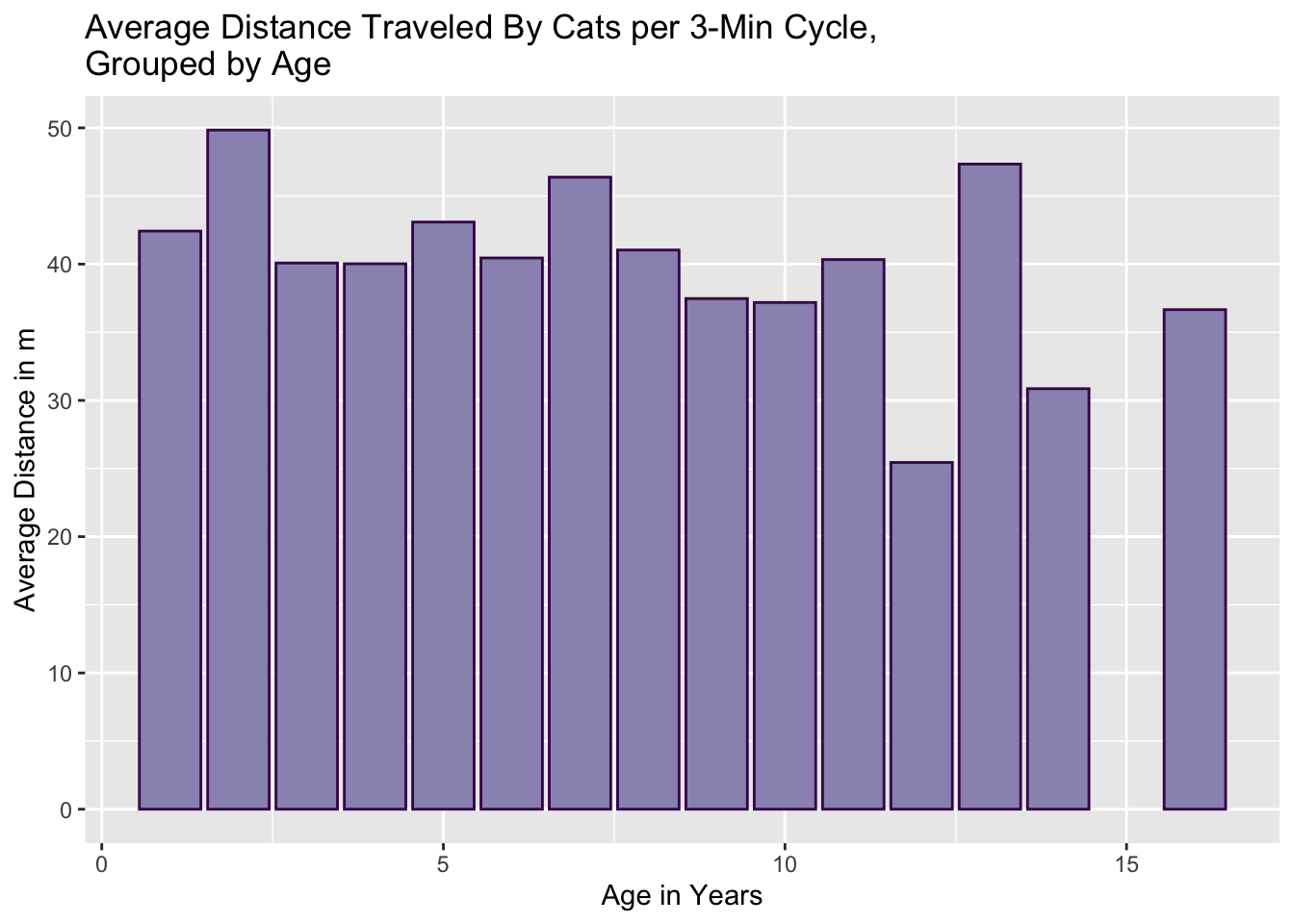 As we can see, there are mixed results from our summary graphs. Cats ages 10 and up tend on average to travel nearly twice the distances than cats less than 10 years old. However, there is little difference in the average distances traveled per three minute cycle for age. Cats seven years or younger travel only slightly further distances than cats older than seven years per three minute cycle.