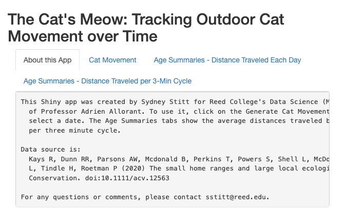 I utilized two methods of analyzing my data. First, I wrangled my data to include only non-outlier, appropriate observations within the United States for all cats that have an age in the metadata dataset. Then, II created summary boxplots that summarized average distances traveled per age group for 3-minute and day intervals to see how cats of different ages compare. Lastly, I created an interactive Shiny app to allow users to generate custom coordinate graphs based on cat and date selection to show cat movement over time.